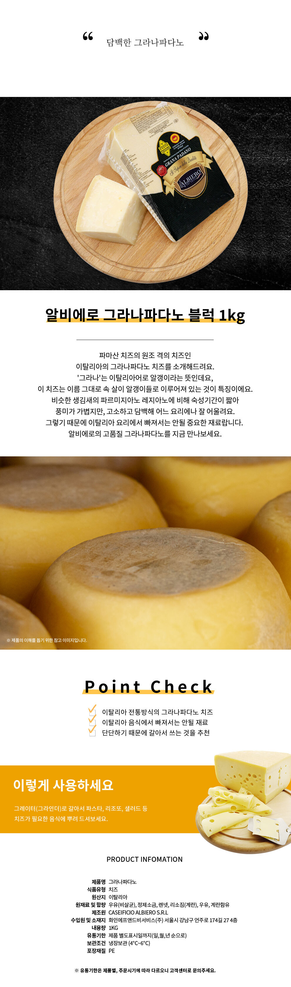 • 정통 이탈리아 D.O.P 알비에로 그라나파다노 블록 1kg