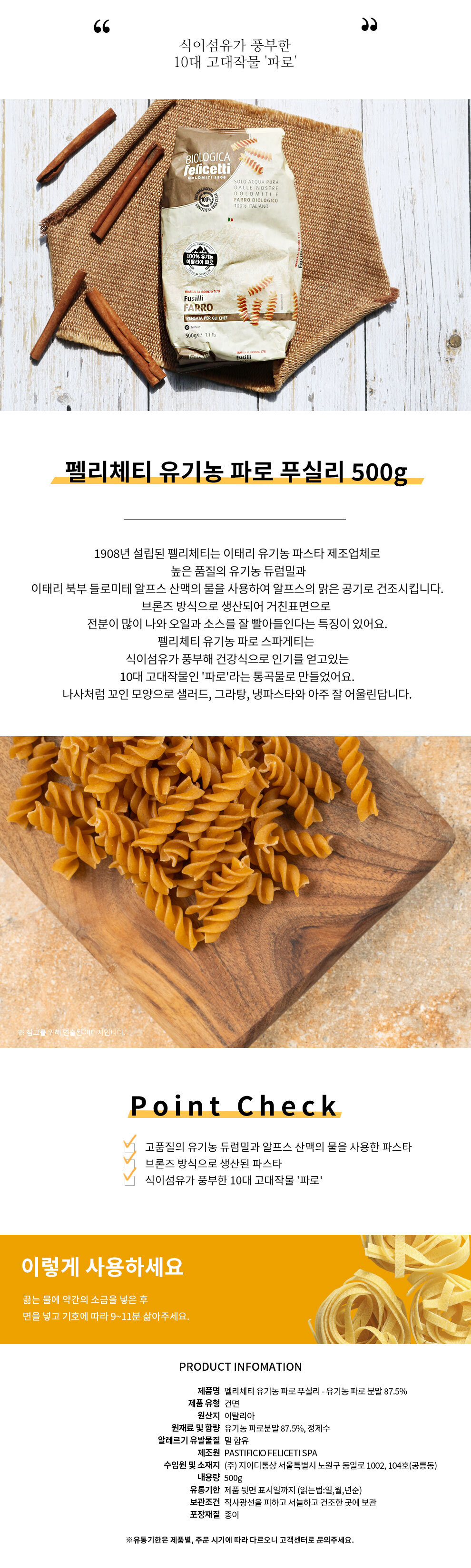 펠리체티 파스타 유기농 파로 푸실리 500g .파스타면 푸질리